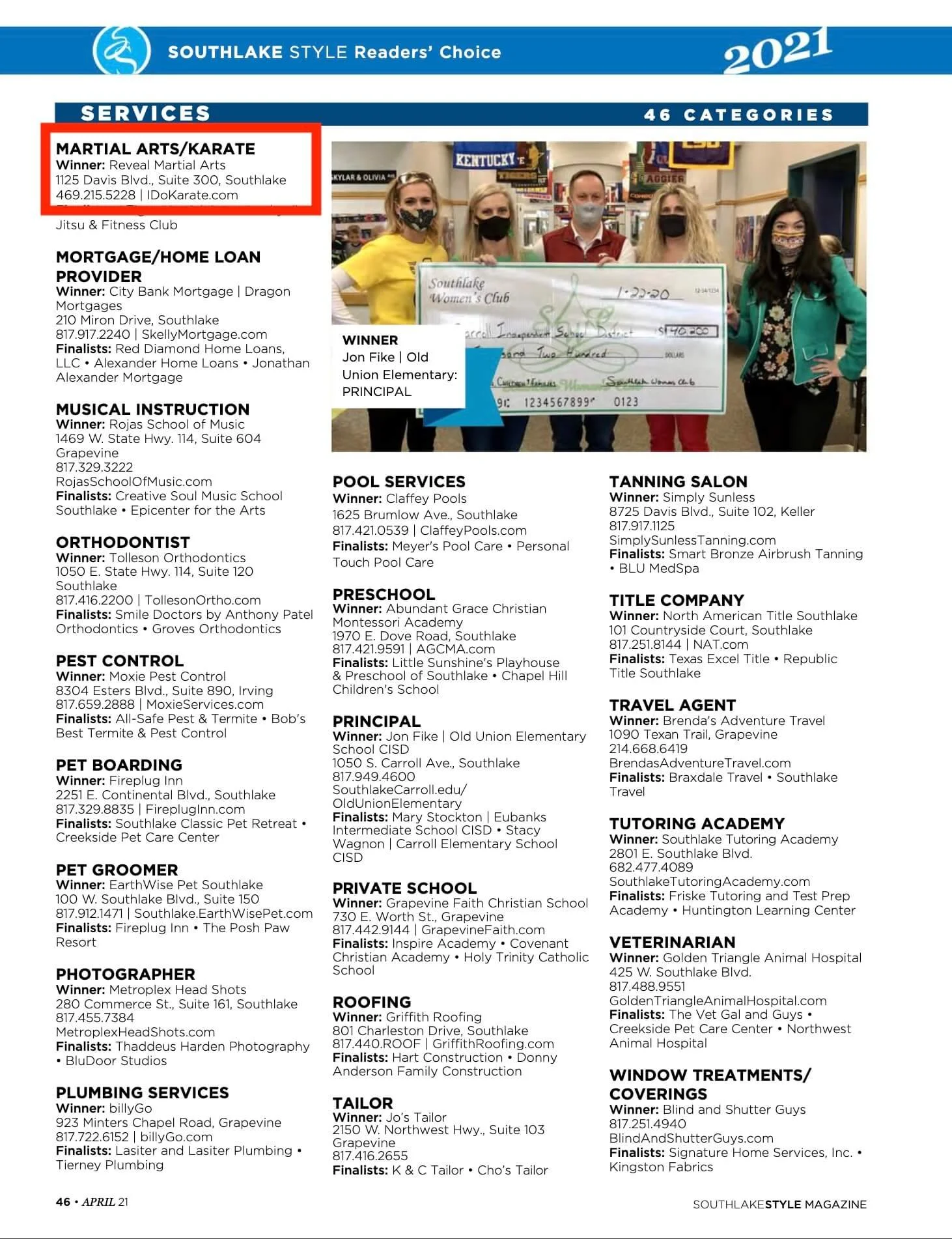 We are very proud to be voted the BEST MARTIAL ARTS STUDIOS in the area by Southlake Style magazine in the April 2021 Readers’ Choice issue.