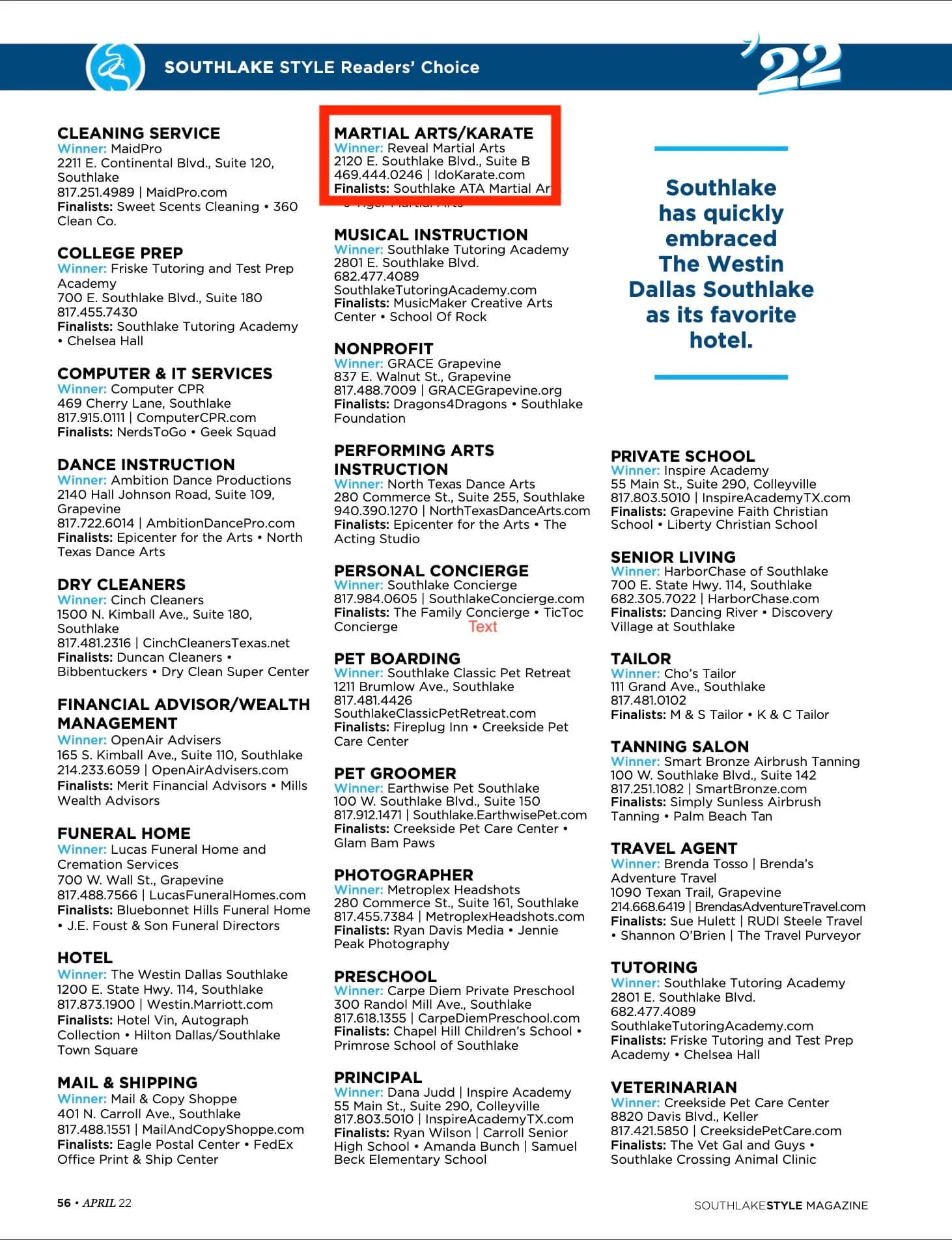 We are very proud to be voted the BEST MARTIAL ARTS STUDIOS in the area by Southlake Style magazine in the April 2022 Readers’ Choice issue.